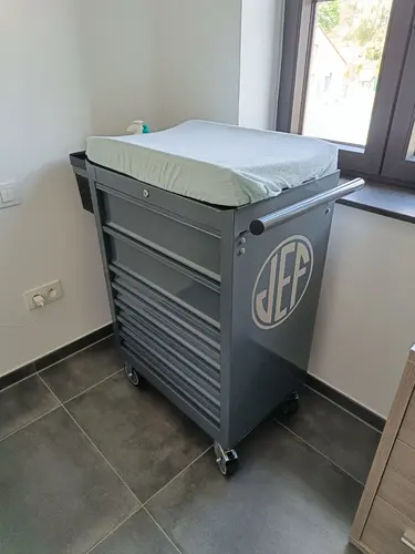Wij hebben een super handige verschoningstafel. Het is een Gereedschapswagen. Mijn partner heeft die in een andere kleur gespoten (grijs ipv rood) en iets aan gelast zodat ik er mandjes aan kan hangen met de meest nodige producten in. Er is echt super veel opbergruimte in, bovenop past perfect een was kussen... En we rijden deze enkel in de badkamer als we hem wassen. Anders staat de kar op zijn eigen kamer 😊
