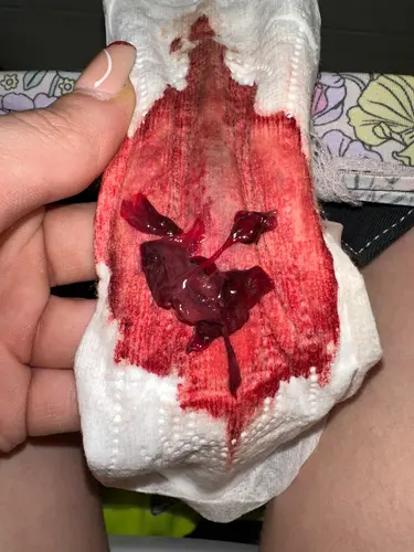 Dat is inderdaad veel bloedverlies, en met stolsel.