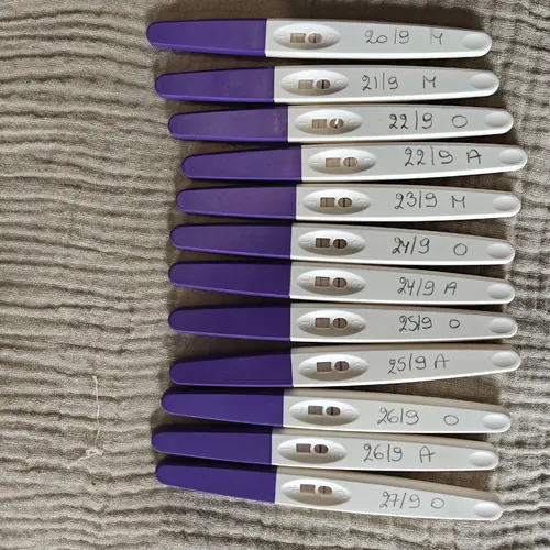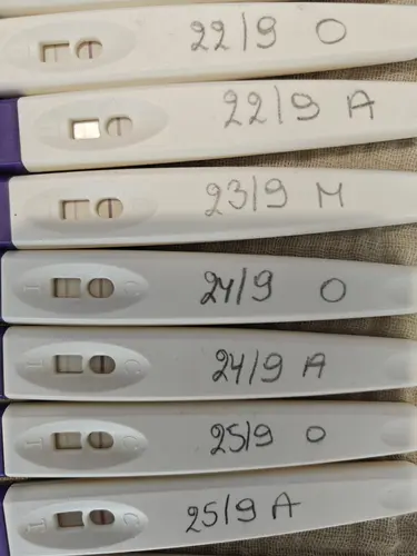 Ik ben al sinds de laatste dag van mijn menstruatie aan het testen. Is 24/9 nu positief? Of moet de piek nog komen? Mij lijkt het streepje toch iets lichter dan het teststreepje en dus niet positief?