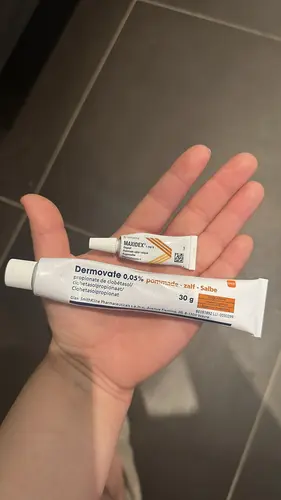 De kleine zalf is enkel voor het gezicht want zware zalf met meer cortisone mag niet. De iets wat grotere is voor de rest van het lichaam. Bij mij voornamelijk hoofd en vingers die erg droog zijn.
