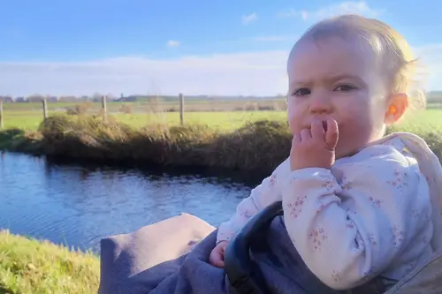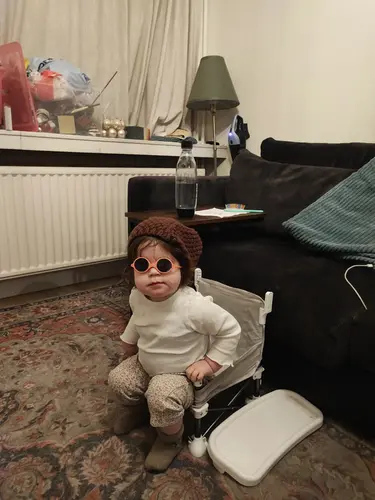 Motoriek: stapt al 10 maanden alleen, loopt, rijdt op loopfiets, laatste kunstjes: draait rondjes en stapt achteruit.