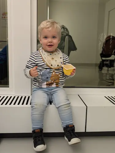 Slapen is heel wisselend. Tot vorige week sliep hij zelfstandig in. Nu wil hij weer dat we in de kamer zitten (max 15min) tot hij slaapt. Afgelopen nacht heeft hij weer doorgeslapen van 18.30-6.45u. Voorbije nachten moest ik tussen 3 en 5 ergens bij hem in bed mee kruipen zodat hij nog verder sliep… Middagdutjes? De ene dag wel, de andere dag niet 😂