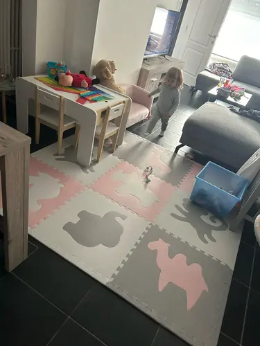 De tegels zijn best dik, groot genoeg om te leren kruipen, rollen,… en makkelijk schoon te maken/op te bergen.